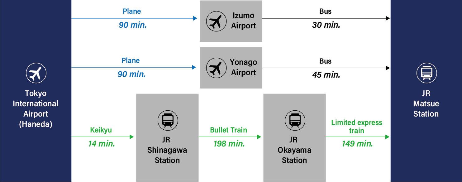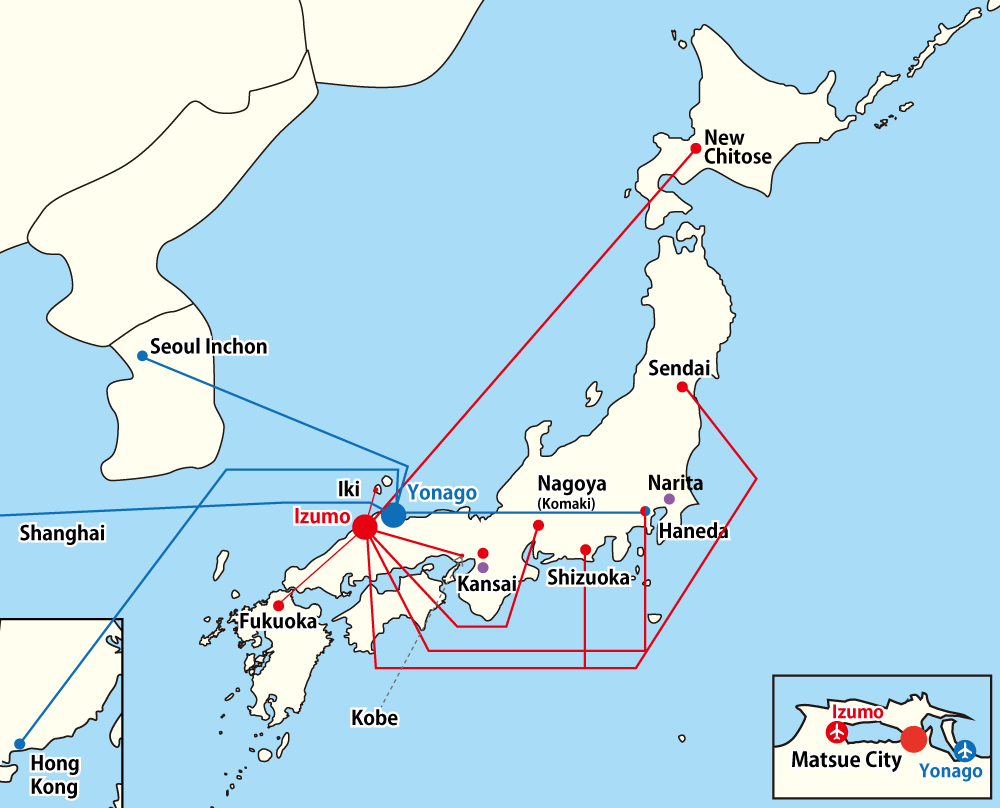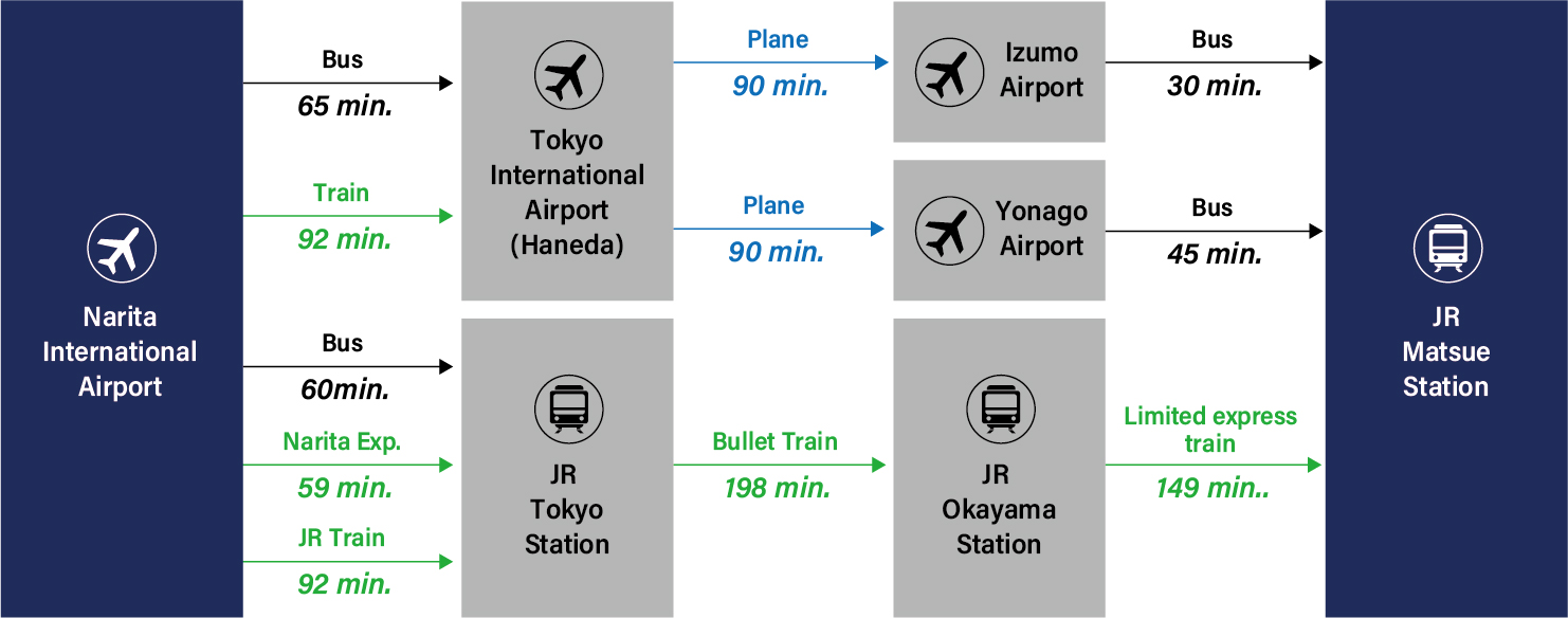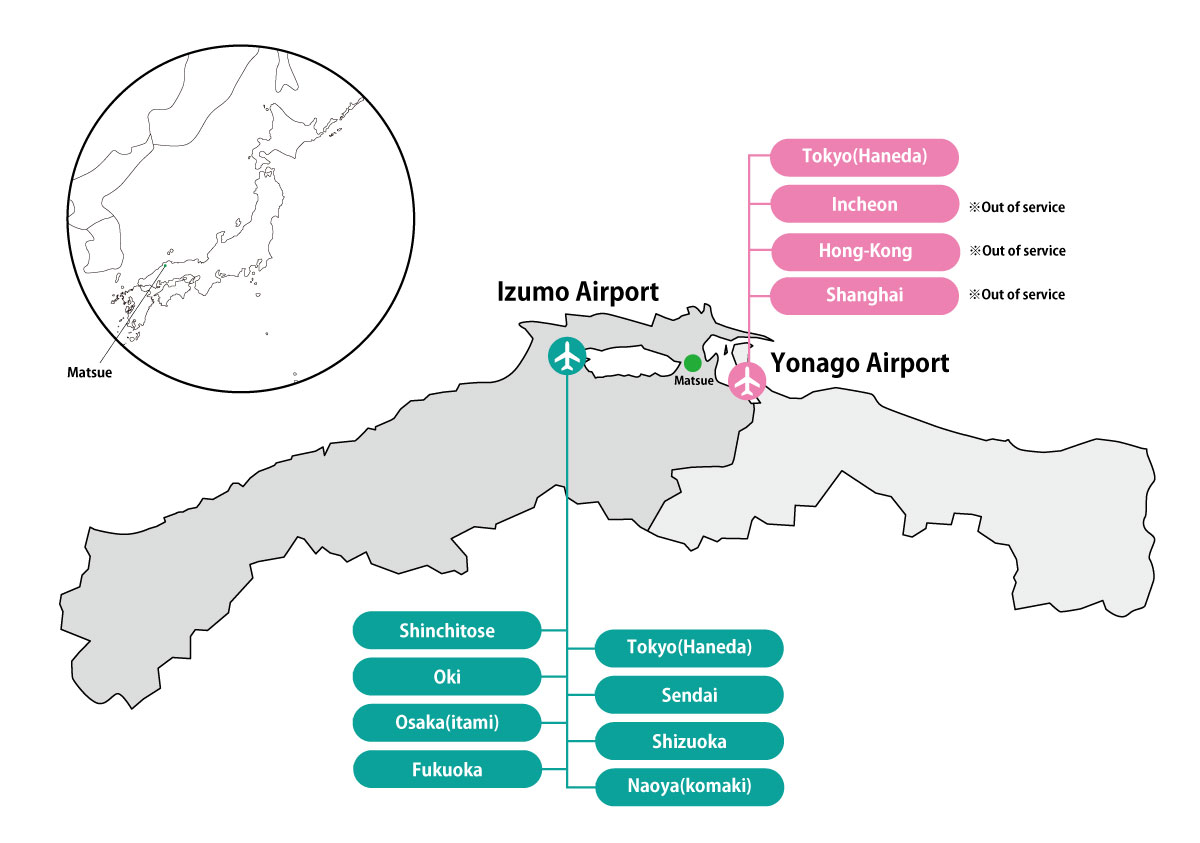 It takes 30 to 45 minutes from both airports to Matsue City (JR Station) by shuttle bus.